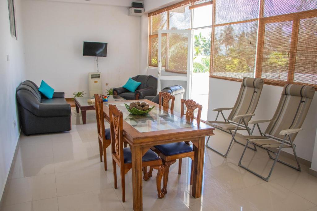 Welcome to Bliss Apartment Hikkaduwa, your perfect retreat situated just steps away from the stunning Hikkaduwa Beach. Our hotel embodies a warm and friendly atmosphere, ensuring you feel instantly at home. With a modern and elegant design, our accommodation offers a delightful blend of comfort and style. As you step into our premises, you'll be greeted by a lush garden, providing a serene setting for relaxation. The availability of free private parking guarantees convenience during your stay. Unwind in our shared lounge or take in the breathtaking views from our terrace, where you can immerse yourself in the tranquility of your surroundings. Our 24-hour front desk staff is always ready to assist you, ensuring your needs are met with utmost care and efficiency. For those traveling from afar, our airport transfer service makes your journey seamless. The shared kitchen is equipped with everything you need, and free WiFi keeps you connected throughout your stay. Each of our air-conditioned rooms is thoughtfully furnished with amenities such as a fridge, stovetop, and kettle. The private bathrooms are equipped with showers and stocked with complimentary toiletries. Some rooms even feature balconies or offer captivating city views. Rest assured, our commitment to your comfort extends to providing high-quality bed linen and towels. Bliss Apartment Hikkaduwa boasts an enviable location, with popular attractions like Narigama Beach, Seenigama Beach, and Hikkaduwa Bus Stand just a stone's throw away. If you're in the mood for exploration, the historic Galle International Cricket Stadium, Dutch Church Galle, and Galle Fort are easily accessible. For an unforgettable stay on the beautiful shores of Hikkaduwa, choose Bliss Apartment Hikkaduwa, where friendly hospitality, modern amenities, and elegant surroundings await you.
