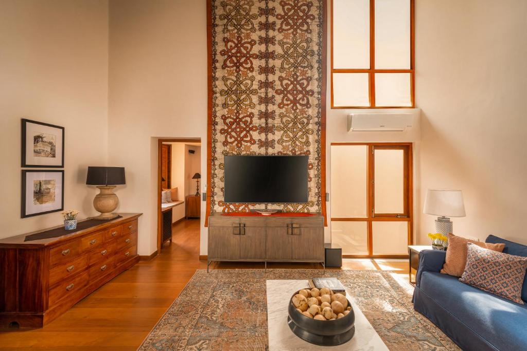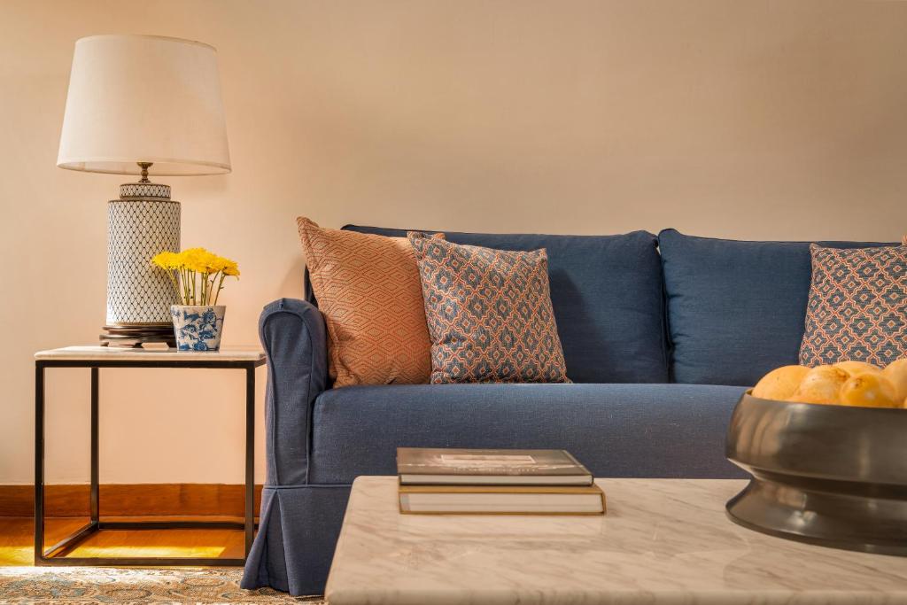 The Corner Suite boasts expansive space, panoramic views, a private terrace, air conditioning, flat-screen TV, and elegant furnishings.